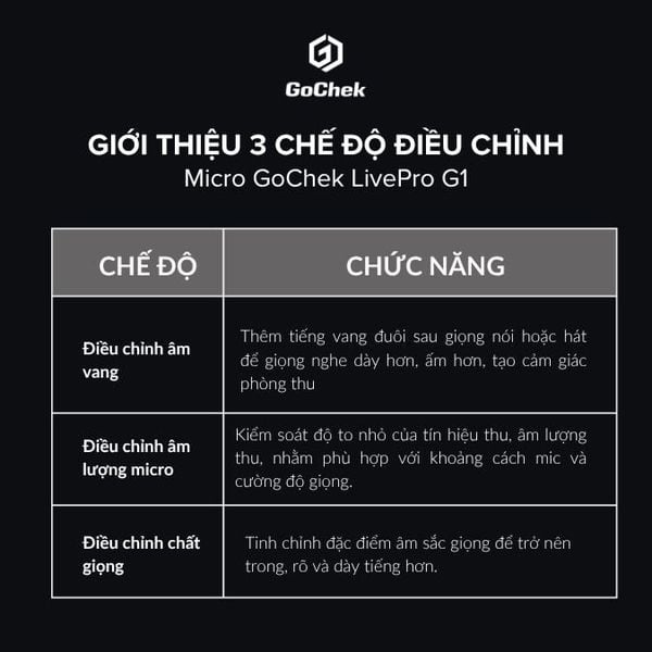 Micro GoChek LivePro G1 được trang bị ba chế độ điều chỉnh độc lập, mỗi chế độ có 15 mức tinh chỉnh chi tiết. Chỉ cần thao tác bấm 1 lần nút bấm duy nhất trên thân mic, quý khách có thể dễ dàng điều chỉnh 3 chế độ sau: