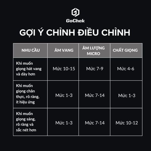 Trong quá trình nghiên cứu và phát triển sản phẩm, GoChek nhận ra ở mỗi khách hàng, nhu cầu về chất giọng và âm thanh đầu ra hoàn toàn khác nhau. Vì vậy, GoChek đã thử nghiệm trên nhiều mẫu giọng và đưa ra một số gợi ý điều chỉnh để quý khách có thể lựa chọn tùy theo nhu cầu riêng: