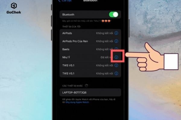Bạn quan sát danh sách các phụ kiện đang hiển thị trong mục Bluetooth. Hãy nhấn vào biểu tượng chữ i nằm ngay cạnh tên thiết bị cần thay đổi. Sau đó bạn chọn tiếp vào mục Tên để bắt đầu quá trình chỉnh sửa.