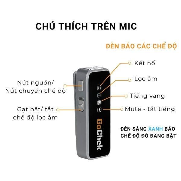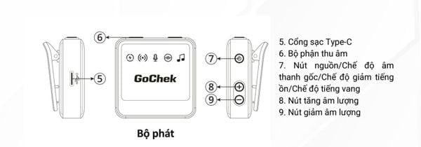 Đây là sản phẩm micro thu âm chuyên dụng dành cho điện thoại được nhiều người tin dùng bởi kích thước nhỏ gọn với chiều dài chỉ 46 mm. Mặt trên của bộ phát bao gồm logo GoChek và các ký hiệu như: Kết nối, Lọc âm, Tiếng vang, Tắt tiếng cho người dùng dễ dàng theo dõi; bên cạnh gồm 2 nút: Nút nguồn/ Nút chuyển chế độ và Gạt bật/tắt chế độ lọc âm.