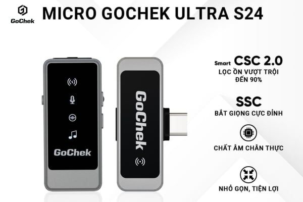 GoChek Ultra S24 là micro thu âm không dây thế hệ mới của GoChek, thiết kế chuyên biệt cho điện thoại và máy tính bảng. Sản phẩm có ba phiên bản: 01 mic không hộp sạc giá 890.000đ, 02 mic không hộp sạc giá 1.190.000đ và 02 mic có hộp sạc giá 1.440.000đ. Tất cả đều được bảo hành 12 tháng, 1 đổi 1 trong 30 ngày nếu lỗi từ nhà sản xuất. Phiên bản có hộp sạc giúp người dùng kéo dài thời lượng pin và bảo quản thiết bị khi di chuyển.