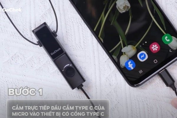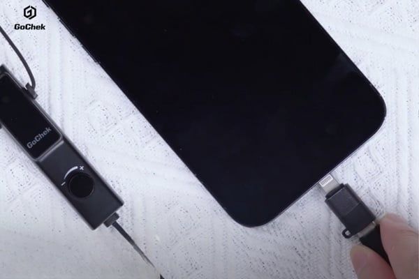 Cắm đầu Type-C của GoChek LivePro G1 vào đầu chuyển đổi, sau đó kết nối với điện thoại. Đèn báo sáng thể hiện thiết bị đã nhận kết nối và sẵn sàng hoạt động.
