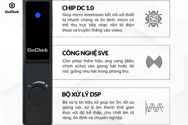 Chip DC 1.0 là bộ phận giúp GoChek LivePro G1 khác biệt so với các micro karaoke thông thường. Chip này cho phép micro kết nối trực tiếp với thiết bị phát nhạc như điện thoại hoặc máy tính bảng, giúp thu nhạc nền và giọng hát cùng lúc mà không cần qua soundcard. Nhờ khả năng xử lý tín hiệu đồng thời, âm thanh đầu ra của G1 luôn giữ được độ đồng bộ giữa nhạc và giọng, tránh hiện tượng lệch pha hoặc trễ tiếng.