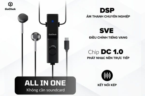 GoChek LivePro G1 là micro karaoke tích hợp tai nghe kiểm âm, sử dụng kết nối có dây qua cổng Type-C