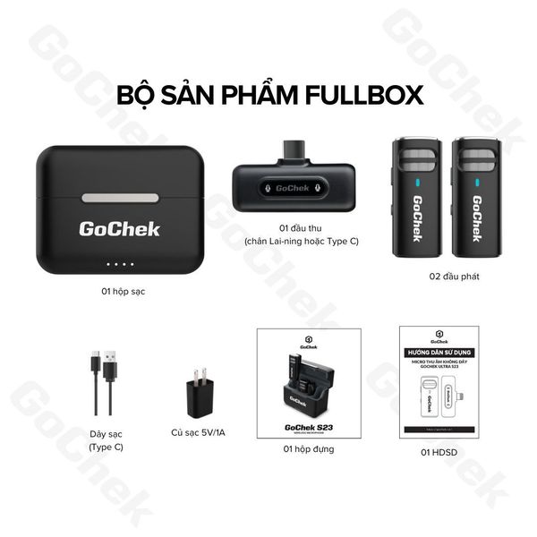 GoChek Ultra S24 hoạt động ổn định với kết nối không dây, tương thích tốt với điện thoại, máy tính bảng và laptop. Người dùng chỉ cần cắm đầu thu vào thiết bị là micro tự động kết nối, không cần cài đặt thêm. Bộ micro có thể hoạt động liên tục 7 giờ, đi kèm bông lọc gió và đầu chuyển đổi type C, lightning tiện lợi khi quay ngoài trời.