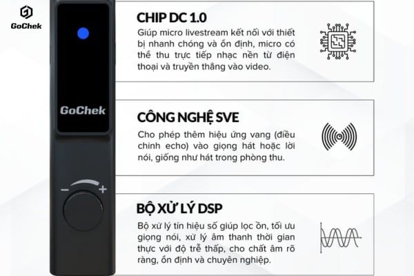 Trung tâm của GoChek LivePro G1 là chip DSP (Digital Signal Processor) kết hợp cùng công nghệ SVE – Smart Vocal Enhancement, giúp xử lý và tái tạo giọng hát với độ chi tiết cao. Hệ thống này hoạt động theo thời gian thực, cân bằng âm sắc và làm dày giọng, đồng thời loại bỏ phần lớn nhiễu nền, mang lại chất âm tự nhiên, rõ nét và chuyên nghiệp.