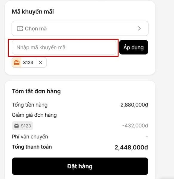 Khi xác định được mã khuyến mãi, quý khách nhập mã vào ô “Mã khuyến mãi”. Hệ thống sẽ tự động áp dụng mức ưu đãi 15% cho đơn hàng nếu mã hợp lệ. Quý khách nhấn “đặt hàng” để hoàn tất.