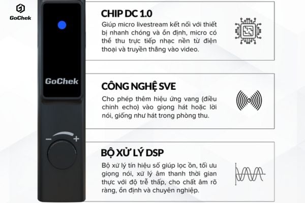 Để tránh trễ tiếng, nên sử dụng mic có chip xử lý tín hiệu DSP giúp truyền tải âm thanh theo thời gian thực. GoChek LivePro G1 ứng dụng công nghệ này kết hợp chip DC 1.0, giúp giọng hát và nhạc nền đồng bộ, giữ chất lượng âm thanh mượt mà và ổn định.