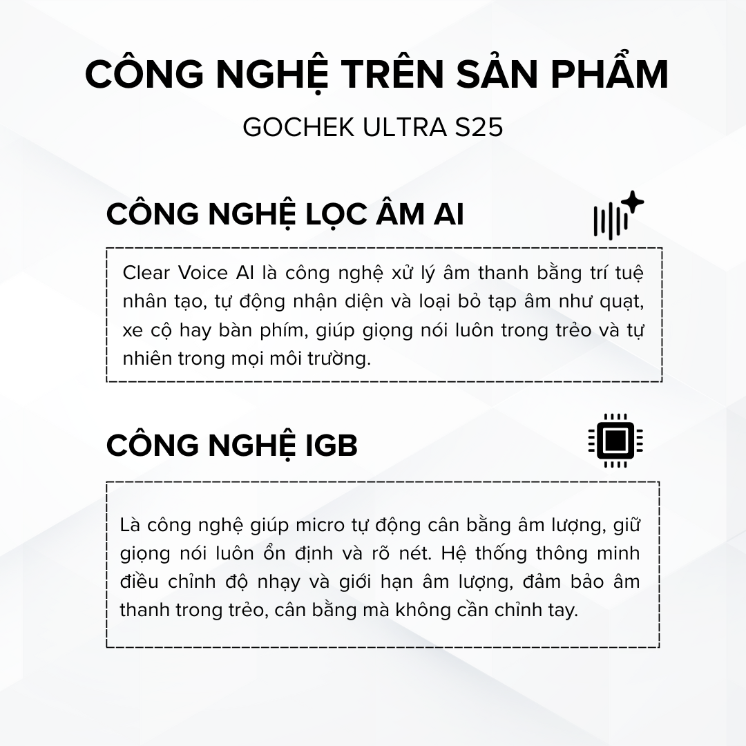 GoChek Ultra S25 là bước đệm nâng hạng cho bất kỳ ai muốn tạo nội dung chuyên nghiệp. Trang bị công nghệ thu âm mới nhất, tự động cân bằng âm lượng, lọc ồn thông minh, tái tạo giọng nói rõ và tự nhiên, GoChek Ultra S25 giúp người dùng tiếp cận chuẩn mực thu âm cao cấp vốn chỉ thấy ở thiết bị đắt tiền. Tất cả được gói gọn trong một giải pháp gọn nhẹ, dễ dùng và giá thành hợp lý, đưa creator, từ người mới đến chuyên nghiệp, lên tầm cao mới trong sáng tạo nội dung.